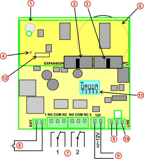 8. Exit button - works in current loop circuit, length of connected conductors can be as long as 500m. To work there must be a 12V power supply connected to the terminal (6).